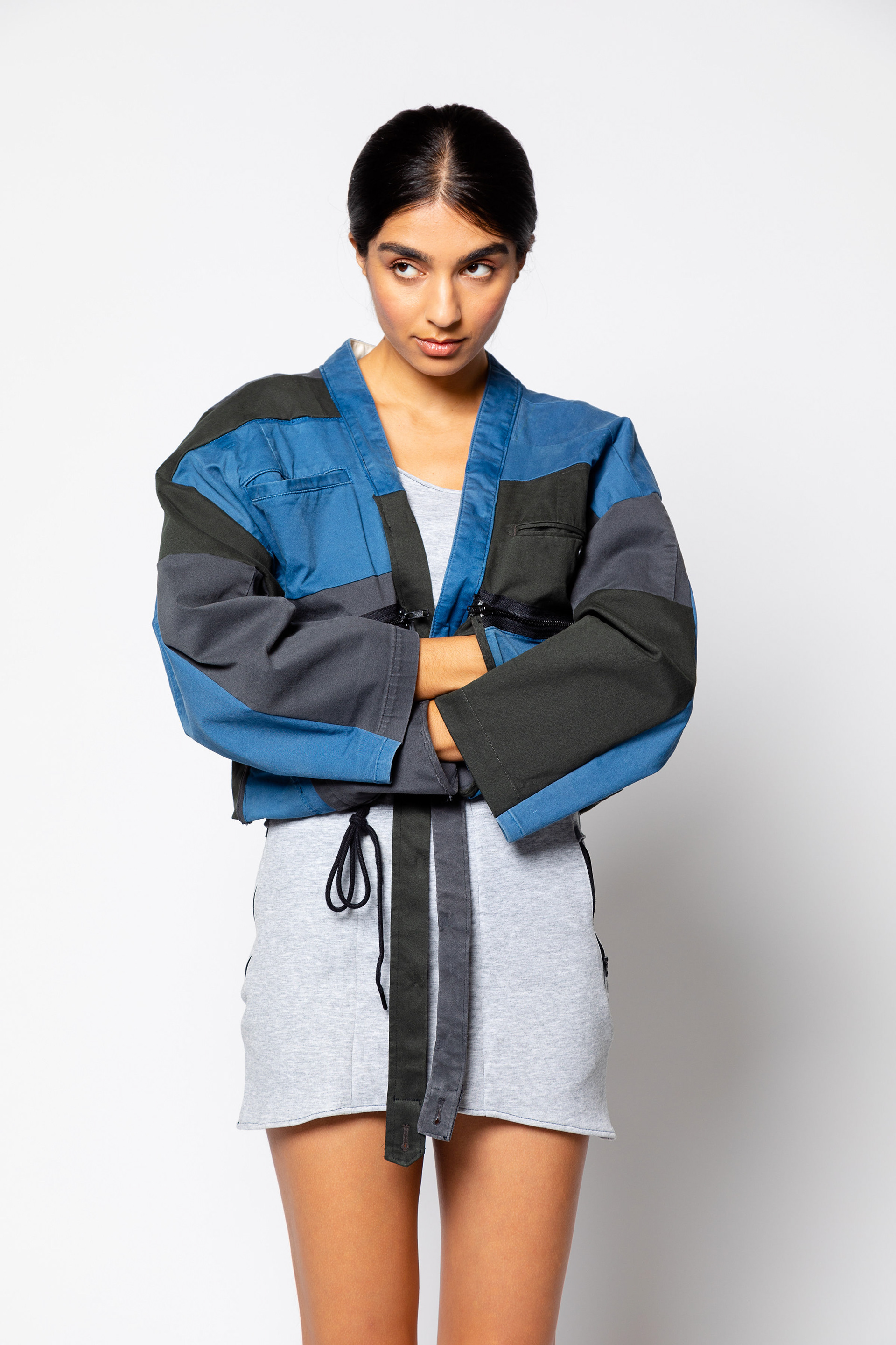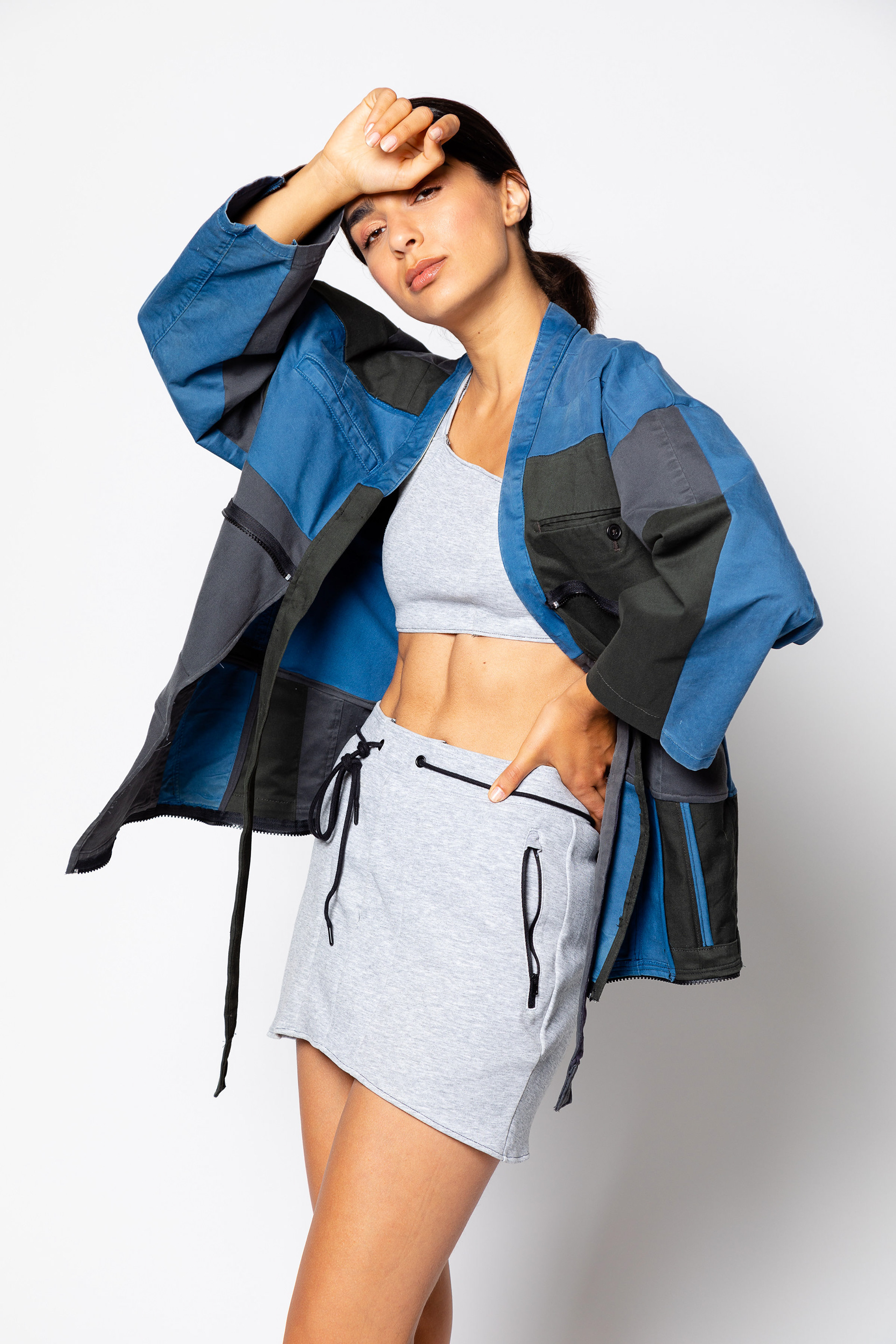 Inspired by the Japanese Kimono, this look uses recycled clothing to create a modern version. The Kimono features a zipper around the waistline allowing the wearer to zip for a shorter look or unzip to create a longer length. The under pieces are made from upcycled sweat pants. This design was made using 100% recycled garments.
