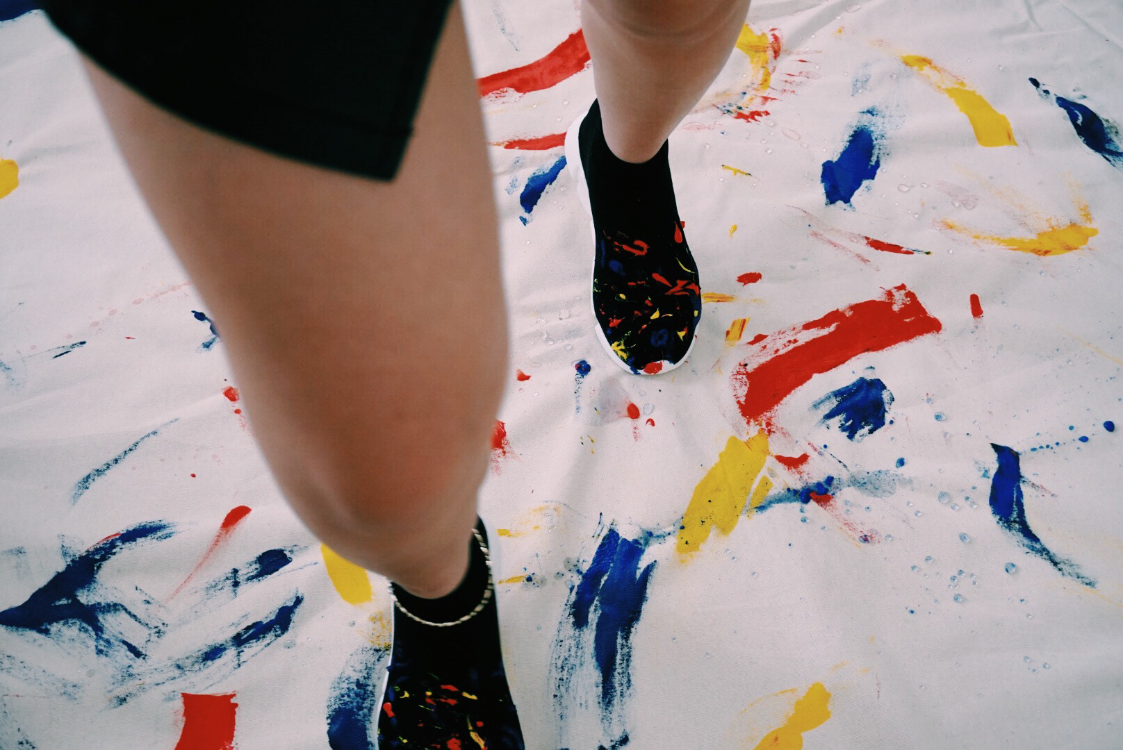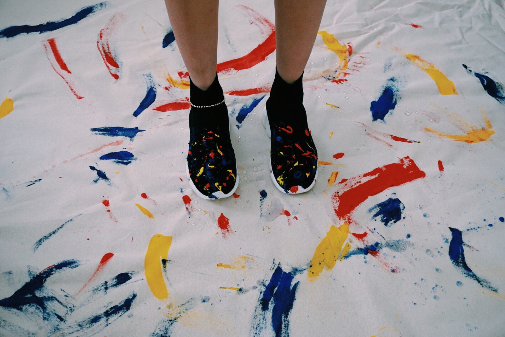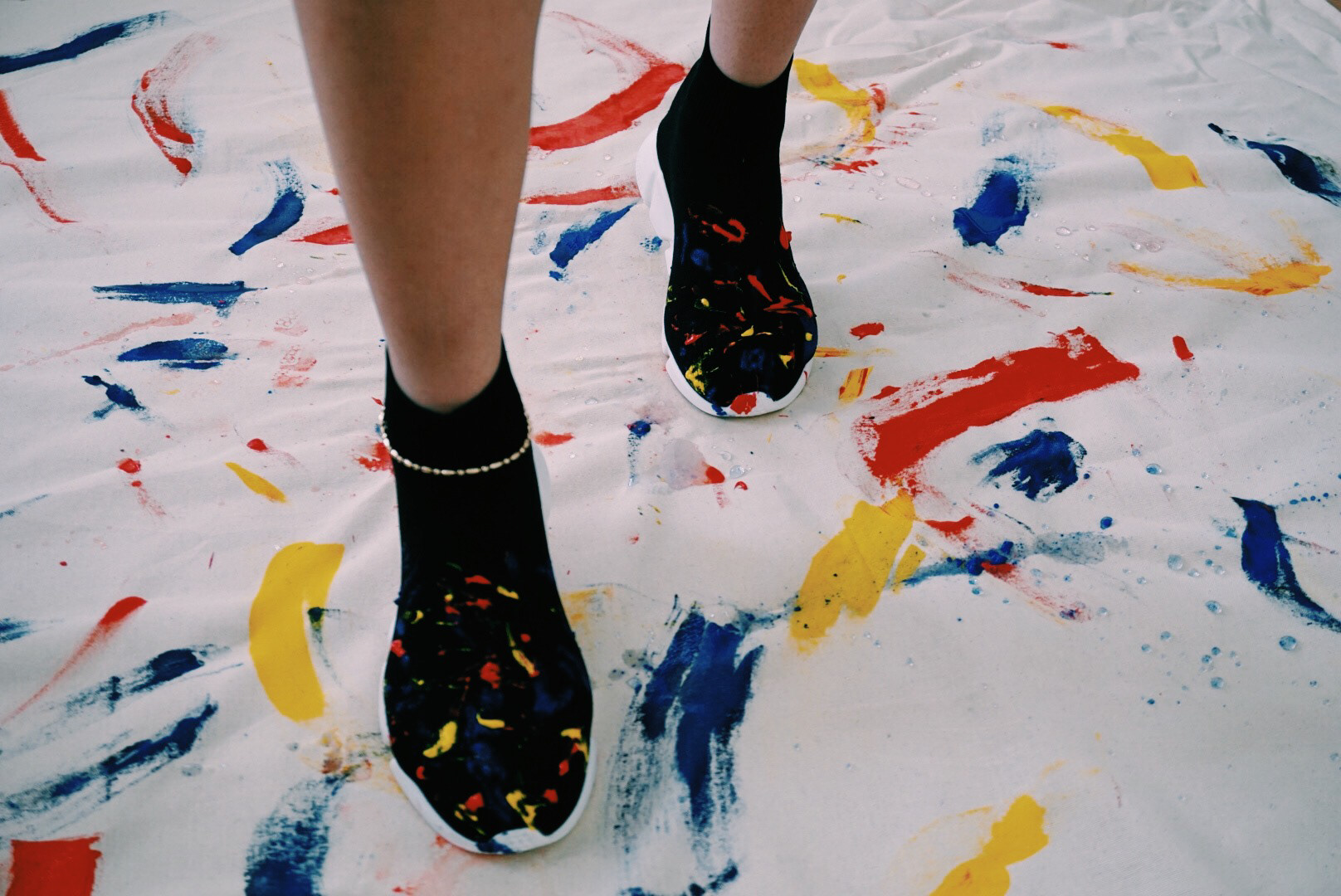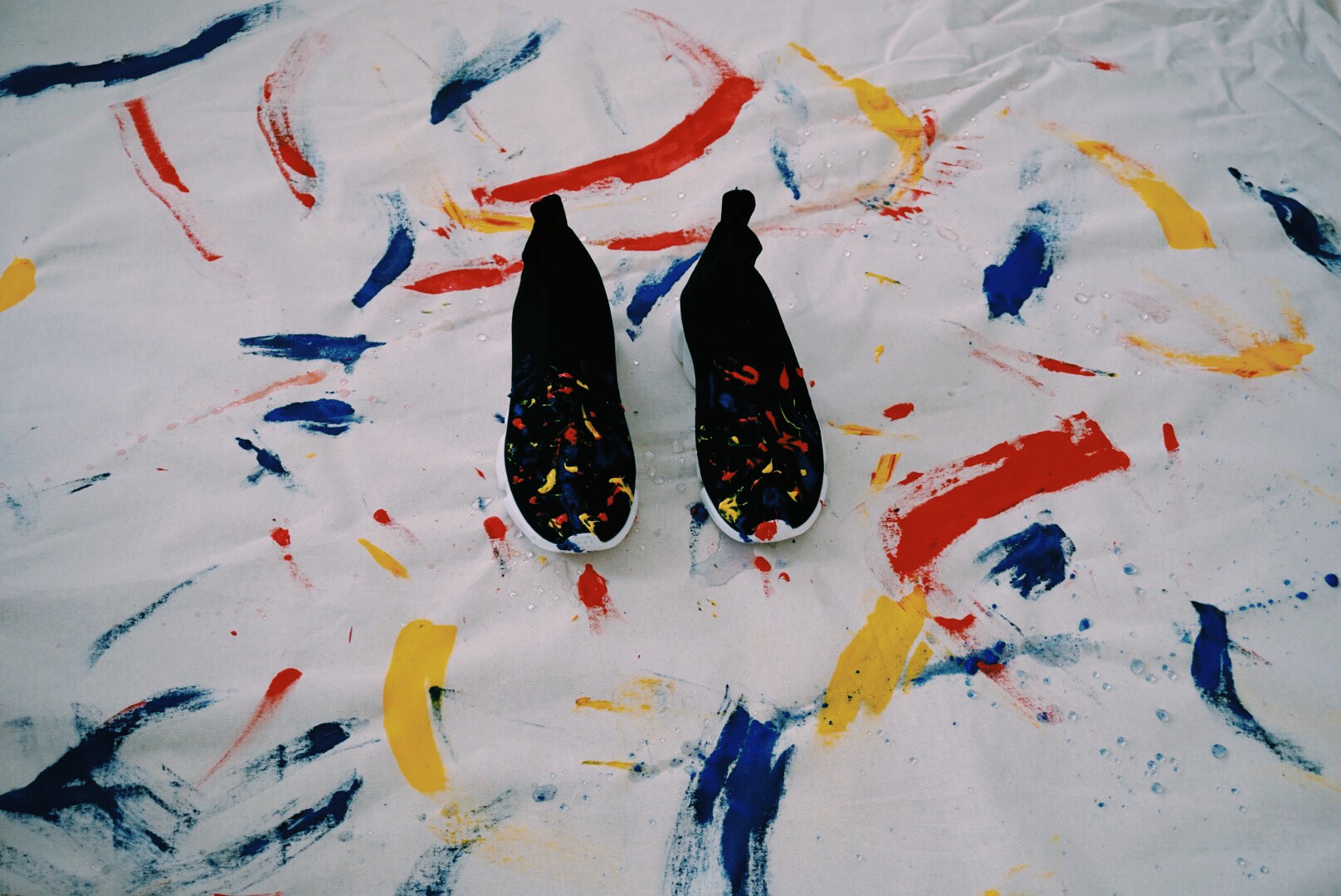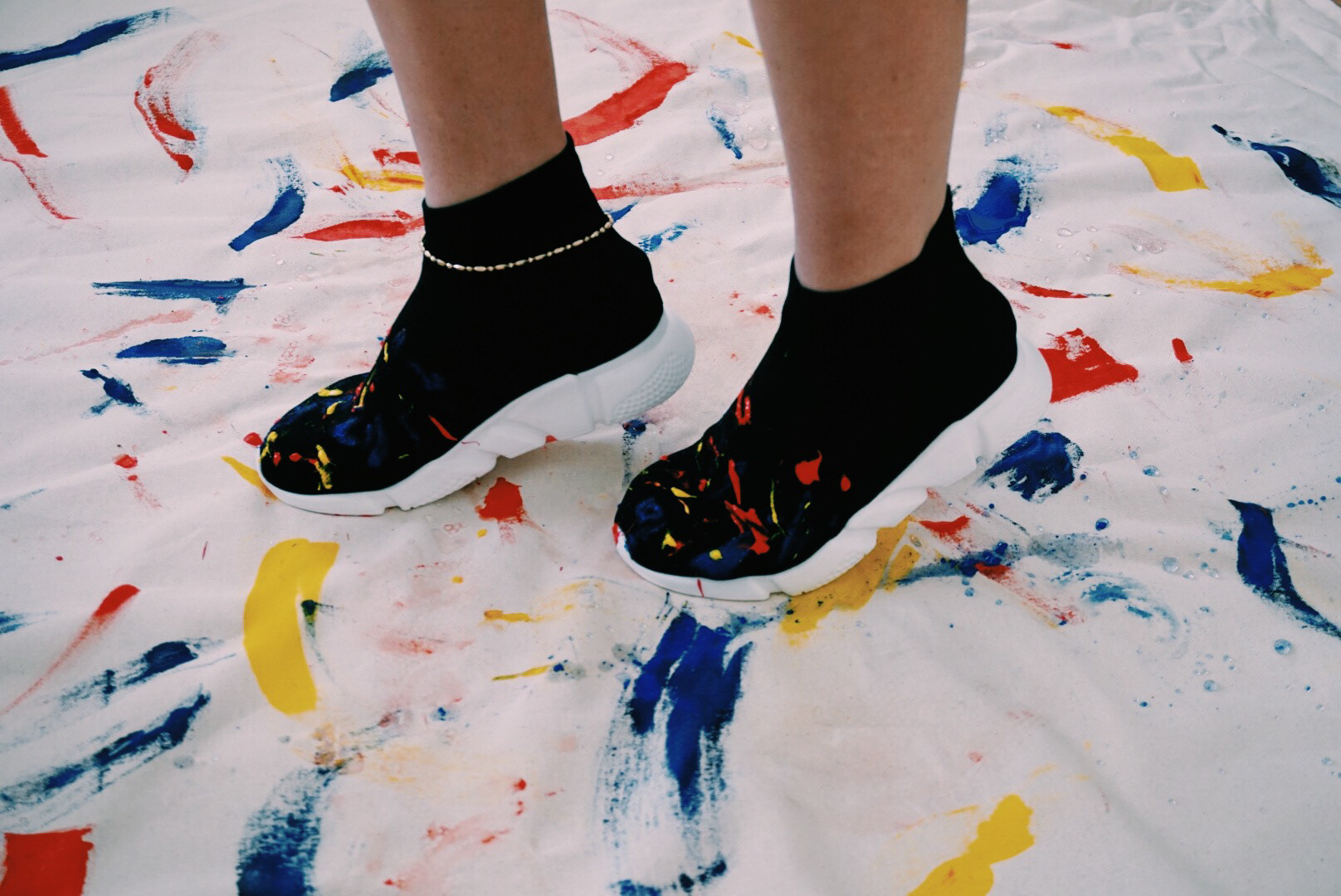 1 of 1 custom sneakers in black with hand-painted finish. Splatter paint in primary colors: red, blue, and yellow. Stretch knit upper. Treaded rubber sole. High-top slip-on.